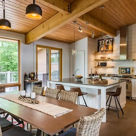 Diese Villa und eine Terrasse bieten einen Blick auf die Berge. Die Villa in Mont-Tremblant verfügt über ein Badezimmer mit einer Badewanne, einer getrennten Toilette und einer Dusche. Es werden auch ein Haartrockner und ein Wäschetrockner angeboten.